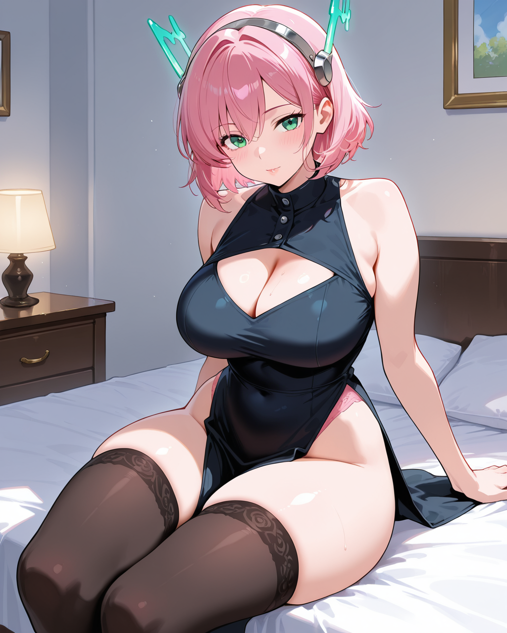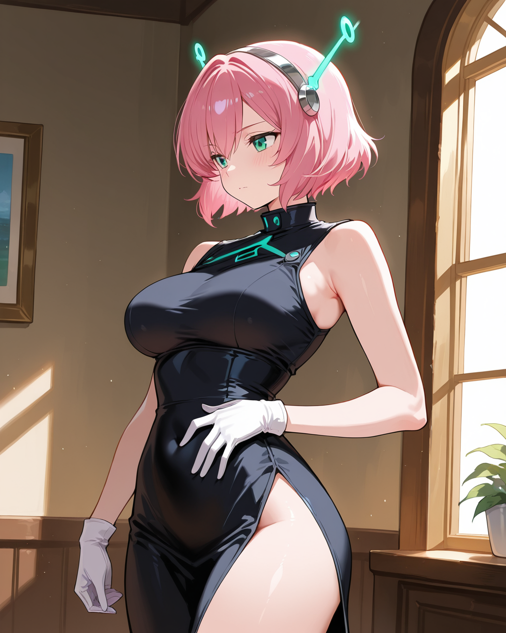 Maria, 1girl, solo, short hair, 밝은 분홍색 머리, 에메랄드 녹색 눈, 금속성 머리 안테나, 검은 드레스, 장갑, 창문, 흰색 장갑, 사이드 슬릿, 서 있는 자세, 소매 없음, 머리 장식, 드레스