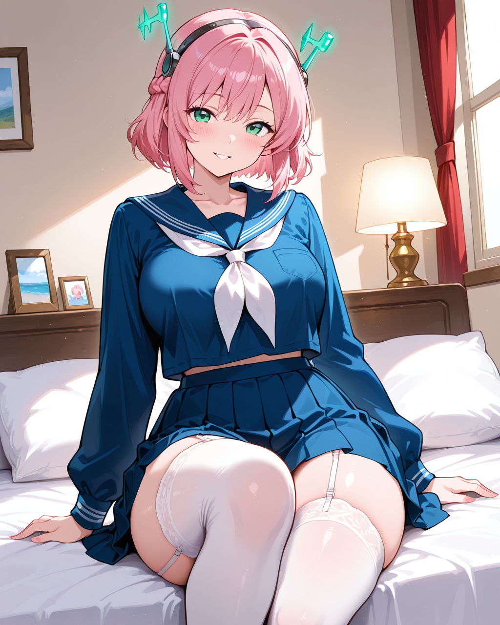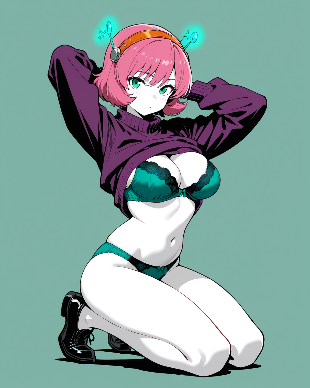 Maria, 1girl, solo, short hair, 밝은 분홍색 머리, 에메랄드 녹색 눈, 금속성 머리 안테나, 장갑, 드레스, 헤어밴드, 흰색 장갑, 짧은 소매, 분홍 드레스