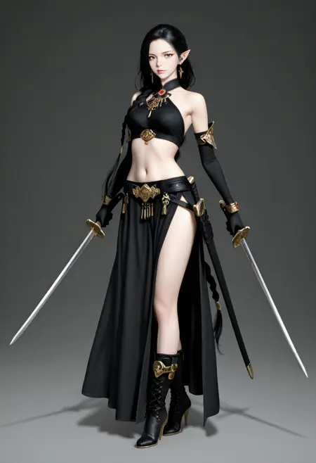 ot4, 1girl, solo, long hair, weapon, braid, boots, high heels, very long hair, sword, black hair, holding, jewelry, midriff, gloves, earrings, bare shoulders, dual wielding, pointy ears, elbow gloves, navel