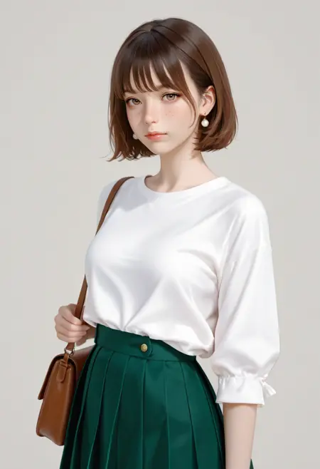 ot7, 1girl, solo, skirt, brown hair, green skirt, jewelry, bag, looking at viewer, shirt, short hair, earrings, freckles, handbag, white shirt, realistic, shoulder bag, simple background, lips, pleated skirt, bangs, closed mouth, grey background