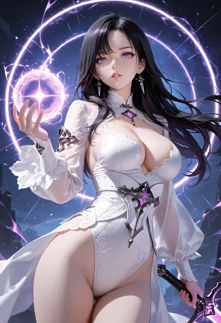 ot3, 1girl, solo, black hair, breasts, purple eyes, jewelry, weapon, earrings, gloves, long hair, sword, white gloves, holding, thighhighs, holding weapon, leotard, cleavage, holding sword, looking at viewer, white leotard, white thighhighs, simple background, cowboy shot, parted lips