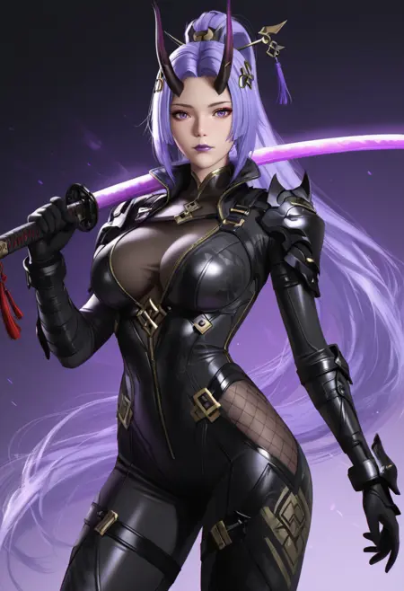 ot1, 1girl, weapon, sword, solo, horns, katana, long hair, armor, holding sword, holding weapon, holding, ponytail, purple hair, bodysuit, breasts, weapon over shoulder, purple eyes, over shoulder, looking at viewer, hair ornament, upper body