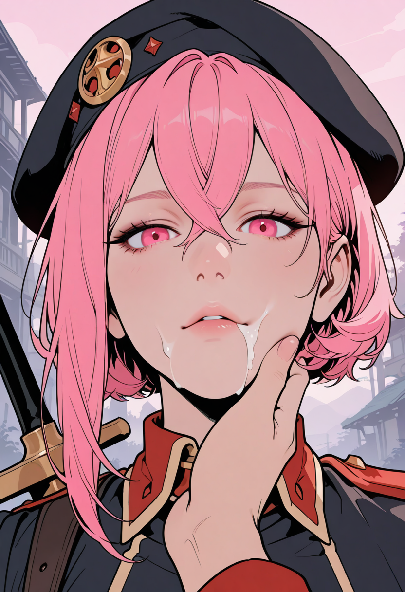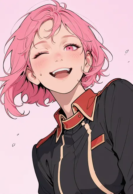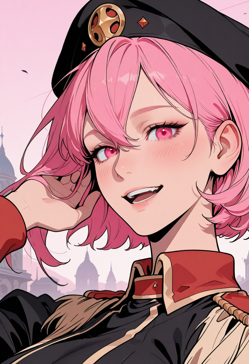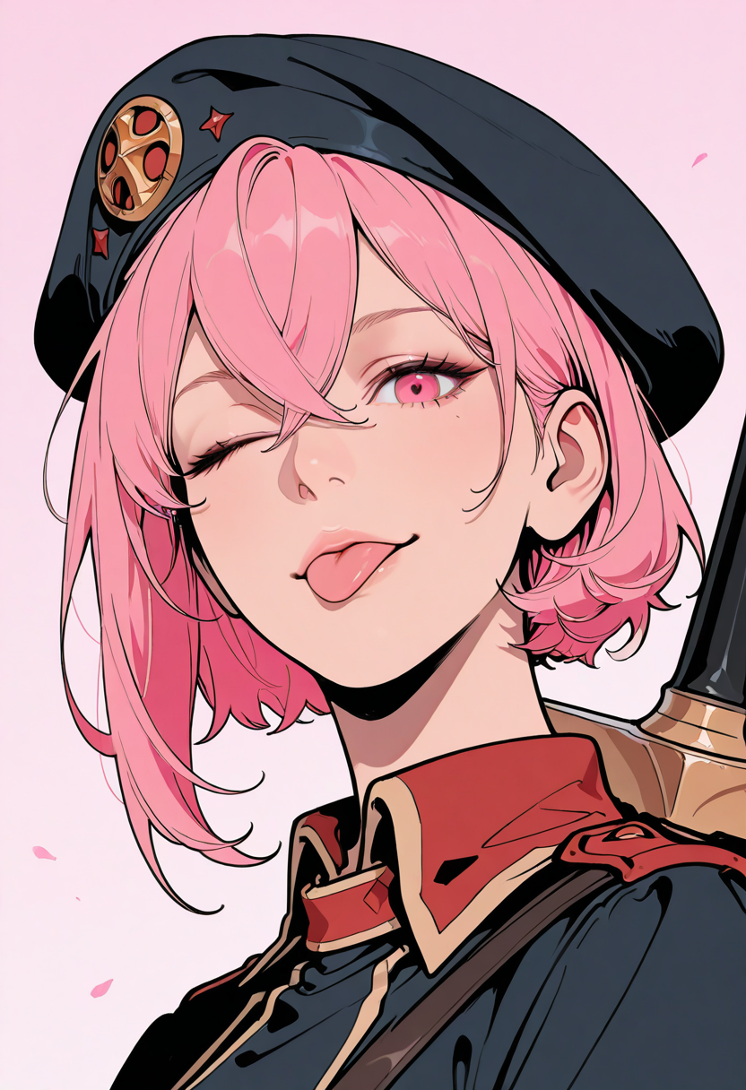 | トレーニングワード | lenny, 1girl, solo, pink hair, short hair, pink eyes, hair between eyes, crossed bangs,コピーしました! jacket, long sleeves, puffy sleeves, hat, black jacket, uniform, black headwear, military uniform,, uniform, military, military uniform, beret, black skirt , white pants, pantyhose, large breasts,コピーしました! |