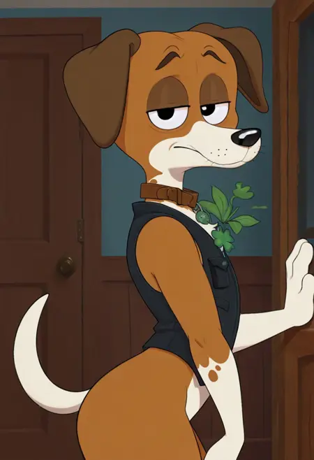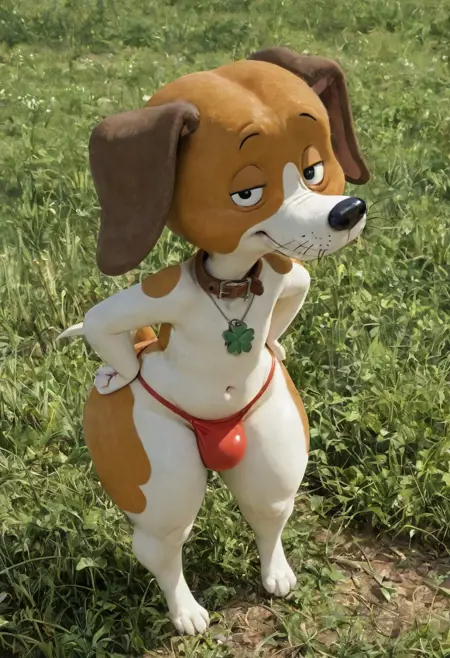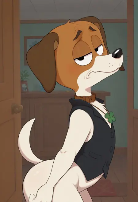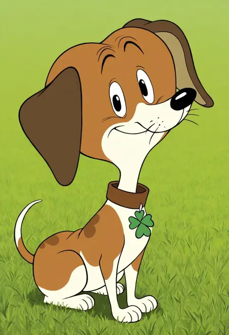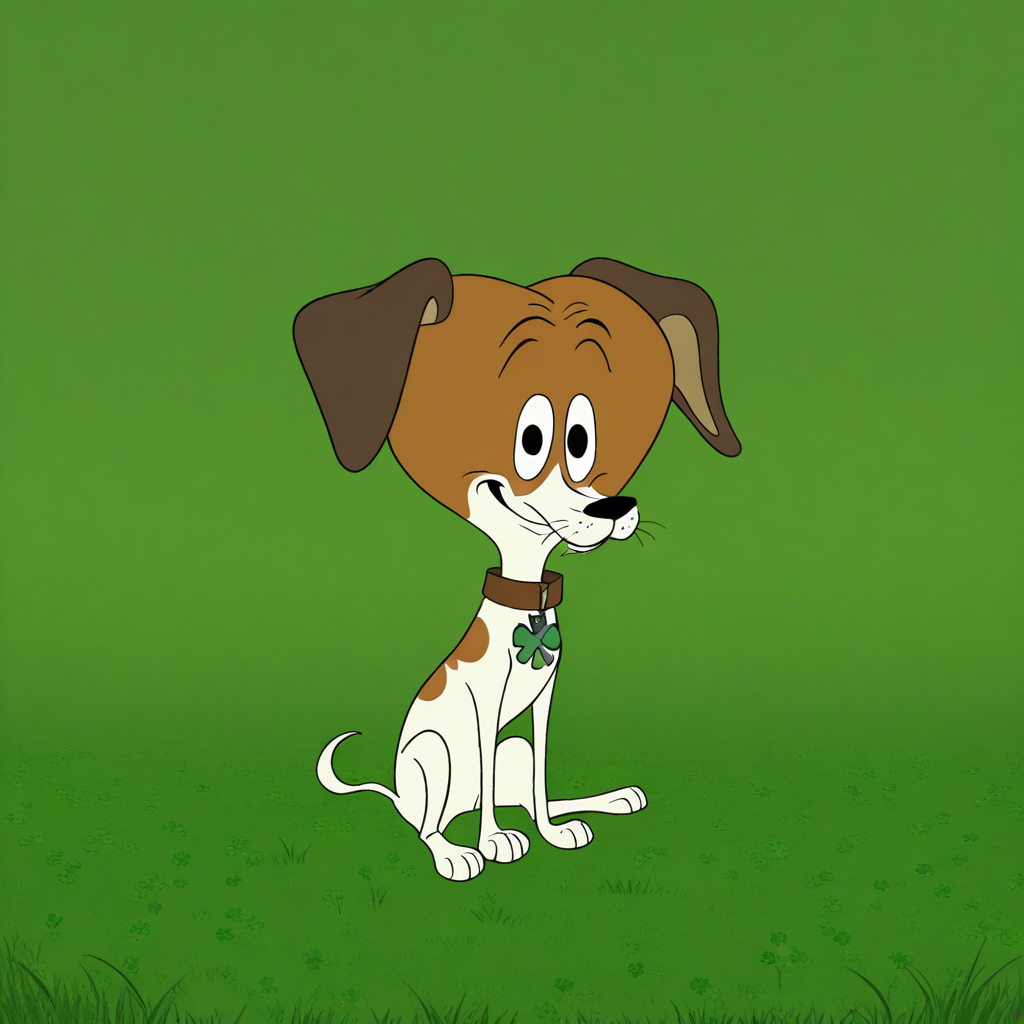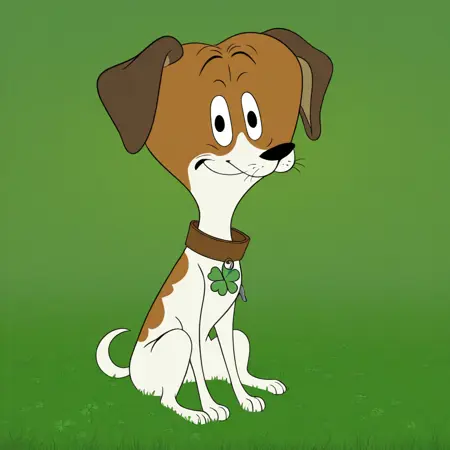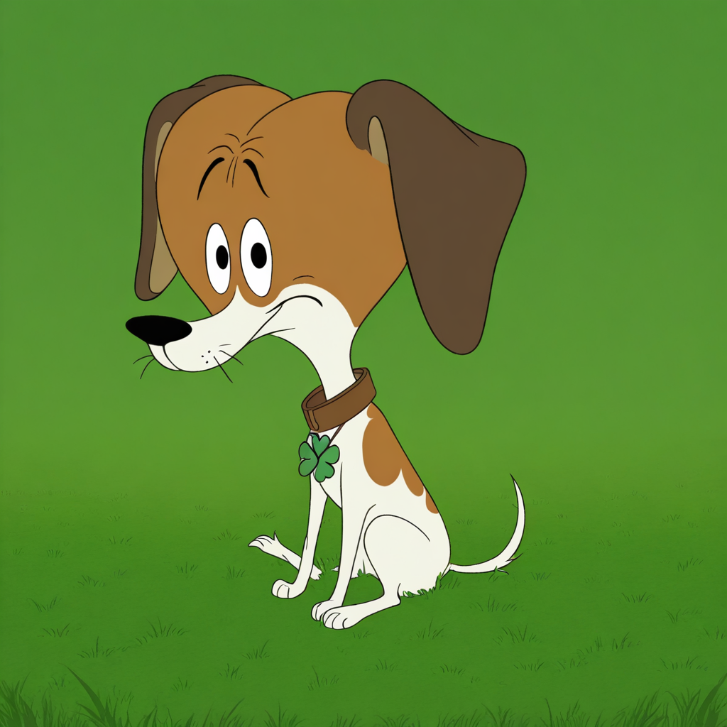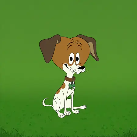 Lucky (F), dog, Beagle, yello-orange middle buff fur, black eyes, small black nose, tiny short whiskers, brown dog ears, dog tail, brown collar, 4 leaves clover dog tag,