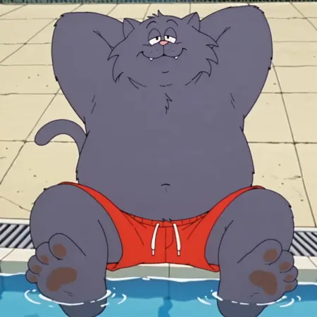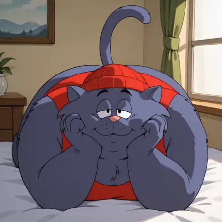 タグ: ファリー男性、男性、ファリー、猫、肥満、太った男性、半閉じた目、ピンクの鼻、尾、赤いビーニー、赤いタンクトップ