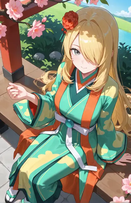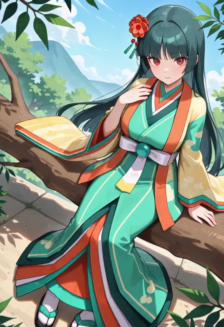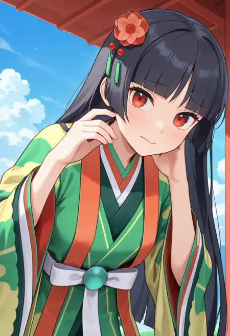머리 장식, 일본 옷, 다색 키모노, 녹색 키모노, 계층적 키모노, 카라기누 모, 넓은 소매, 긴 소매, 띠, 매우 긴 치마, 열린 키모노, 타비, 샌들