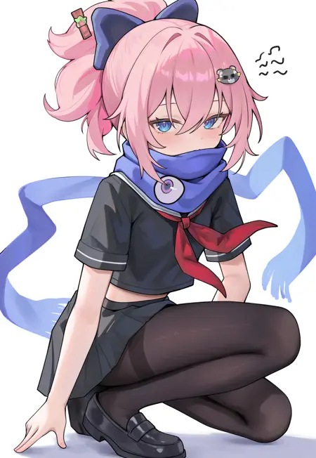 komachiastralpartyunicloth,blue scarf,sentient scarf,red neckerchief,white sailor collar,black crop top,black miniskirt,black thighband pantyhose, black loafers