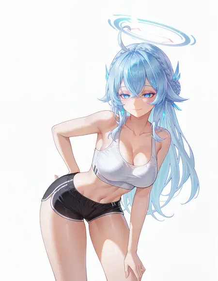 ロズリン、青い髪、青い目、クラウン編み、編み上げて結った髪、ピンクのアイライナー、髪飾り、ヘアクリップ、色付きまつげ、シンボル形状の瞳、長い髪、あほ毛、ハロー、誘惑的な笑み、半閉じた目、イヤリング、