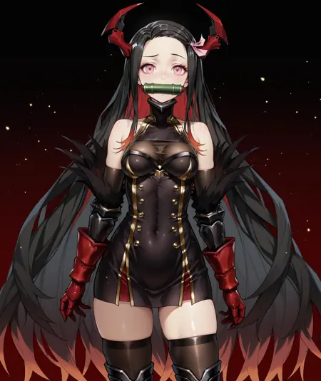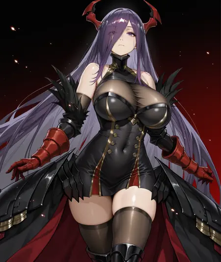 - 가슴, 가슴선, 어깨 노출, 장갑, 드레스, 소매 없음, 검은 장갑, 팔꿈치 장갑, 검은 드레스, 투명, 젯타이 리ョ우키, 소매 없는 드레스, 배꼽 가림, 단추, 스킨 디텐테이션, 짧은 드레스, 겐틀릿, 붉은 장갑, 금장식, 더블버튼, 단단하게 끼는 옷, 단단하게 끼는 드레스, 투어하이, 허벅지, 부츠, 검은 투어하이, 검은 신발, 무릎 부츠, 갈색 투어하이, 갑옷 부츠,