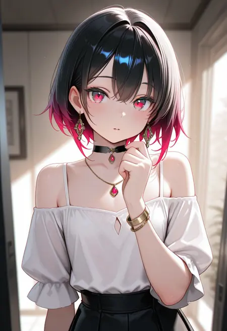 1boy, male focus, kaoru, otoko-no-ko, femboy, crossdresser boy, choker, jewelry, bracelet, earrings, necklace, black hair, short hair, wolfcut, one side longer, gradient hair, hair between eyes, parted lips, two-tone hair, red hair, flat chest, red eyes, pink eyes,