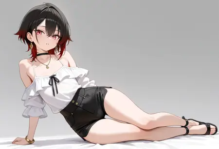 1boy, male focus, kaoru, otoko-no-ko, femboy, crossdresser boy, choker, jewelry, bracelet, earrings, necklace, black hair, short hair, wolfcut, one side longer, gradient hair, hair between eyes, parted lips, two-tone hair, red hair, flat chest, red eyes, pink eyes,