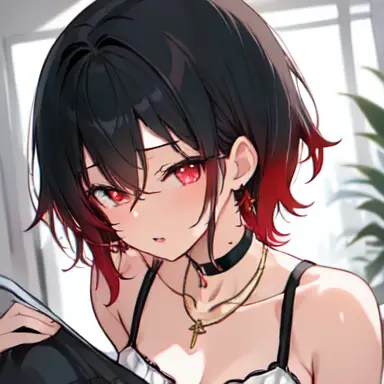 1boy, male focus, kaoru, otoko-no-ko, femboy, crossdresser boy, choker, jewelry, bracelet, earrings, necklace, black hair, short hair, wolfcut, one side longer, gradient hair, hair between eyes, parted lips, two-tone hair, red hair, flat chest, red eyes, pink eyes,