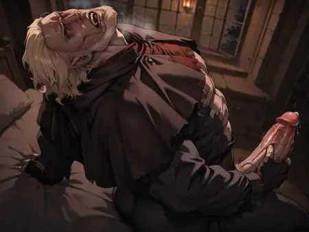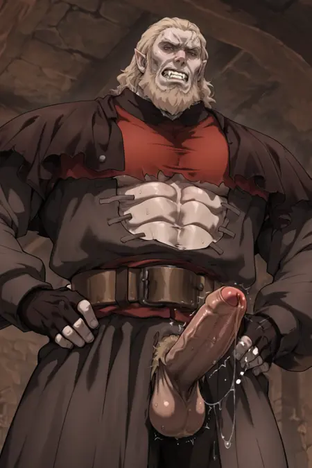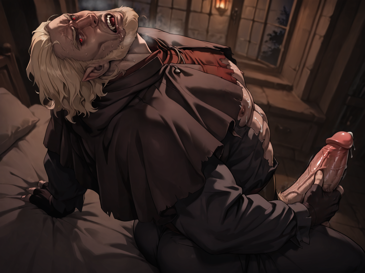 1vn_cstlvn, 1boy, solo, facial hair, blonde hair, pointy ears, torn red shirt, brown capelet, brown eyes, vampire, fingerless gloves, pale skin, fangs,