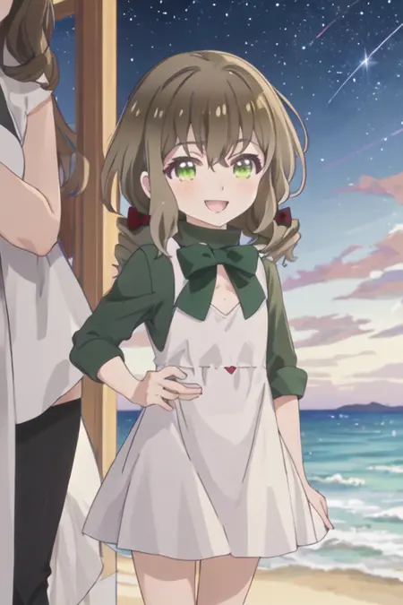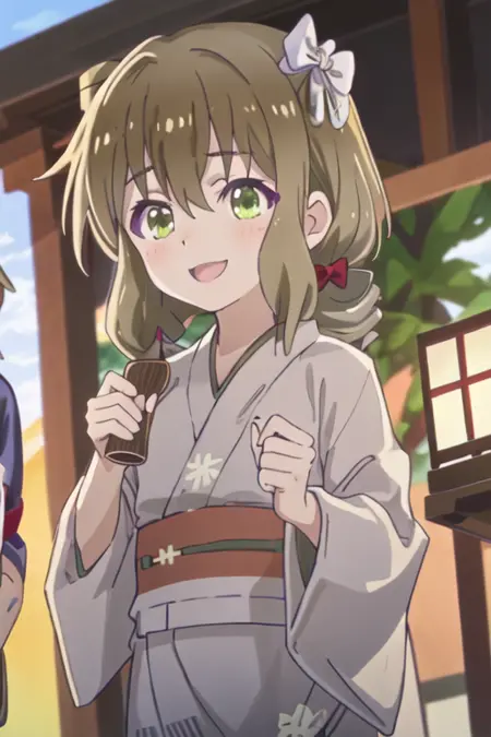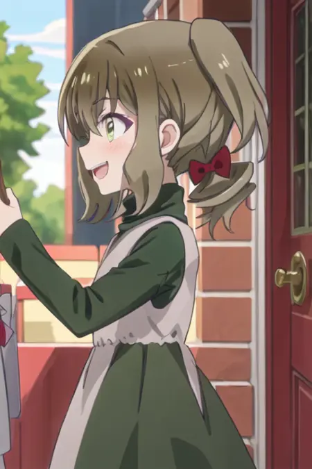 トリガー語はshuri_kumakumakumabear、推奨タグはbest quality, masterpiece, highres, solo, {shuri_kumakumakumabear:1.15}, brown_hair, bangs, green_eyes, hair_between_eyes, bow, hair_bow, red_bow, blush, open_mouth, smileです。