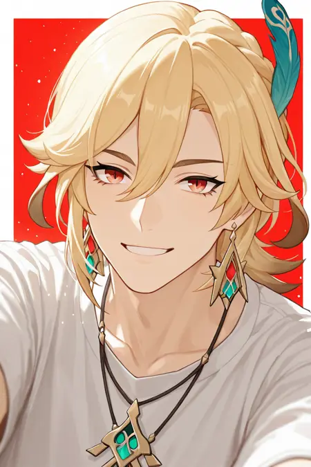 kaveh (genshin impact)-9th_1male focus, blonde_kaveh (genshin impact)_hair, kaveh (genshin impact)_earrings, kaveh (genshin impact)_hair ornament, red_kaveh (genshin impact)_eyes