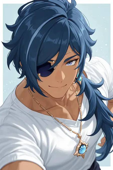 kaeya (genshin impact)-8th_dark-skinned 1male focus, dark blue_kaeya (genshin impact)_hair, kaeya (genshin impact)_eyepatch, kaeya (genshin impact)_jewelry, blue_kaeya (genshin impact)_eyes