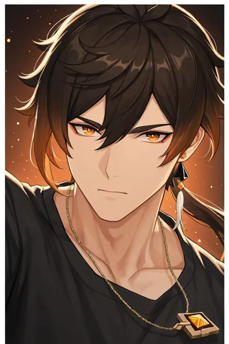 zhongli (genshin impact)-15th_1male focus, black-orangish brown_zhongli (genshin impact)_hair, zhongli (genshin impact)_jewelry, reddish orange-yellow_zhongli (genshin impact)_eyes, zhongli (genshin impact)_makeup