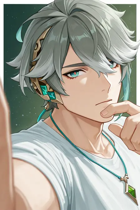 alhaitham (genshin impact)-1st_1male focus, grey-green_alhaitham (genshin impact)_hair, red-white_alhaitham (genshin impact)_symbol-shaped pupils, gold-blue_alhaitham (genshin impact)_headwear, light blue_alhaitham (genshin impact)_eyes