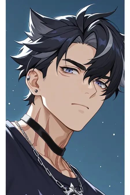 wriothesley (genshin impact)-14th_1male focus, black-white_wriothesley (genshin impact)_hair, brown_wriothesley (genshin impact)_scar under single eye, wriothesley (genshin impact)_jewelry, blue_wriothesley (genshin impact)_eyes