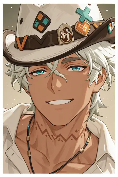 ifa (genshin impact)-6th_dark-skinned 1male focus, ifa (genshin impact)_hat, white_ifa (genshin impact)_hair, blue-yellow_ifa (genshin impact)_eyes, brown_ifa (genshin impact)_scar across single eye