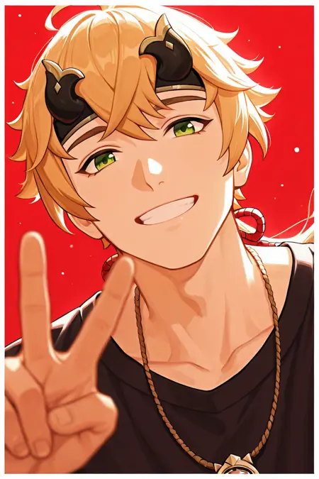 thoma (genshin impact)-13th_1male focus, green_thoma (genshin impact)_eyes, thoma (genshin impact)_fake horned headband, blonde_thoma (genshin impact)_hair