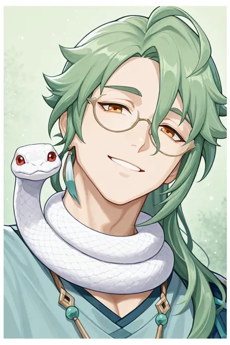 baizhu (genshin impact)-3rd_1male focus, green_baizhu (genshin impact)_hair, baizhu (genshin impact)_glasses, yellow_baizhu (genshin impact)_eyes, white-red_baizhu (genshin impact)_snake around neck