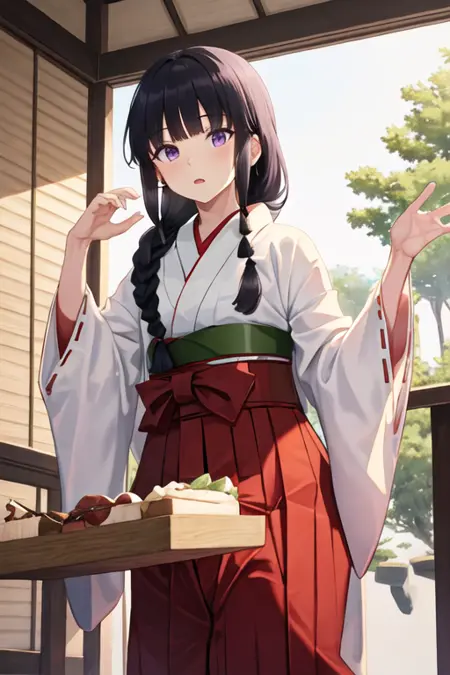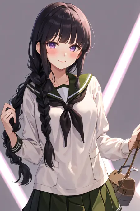 トリガー語はkitakami_kantaicollection、推奨タグはbest quality, masterpiece, highres, solo, {kitakami_kantaicollection:1.15}, long_hair, black_hair, braid, bangs, single_braid, blunt_bangs, sidelocks, serafuku, purple_eyesです。