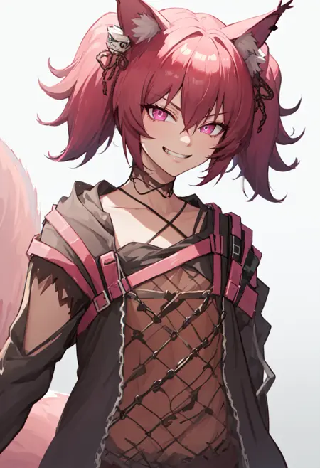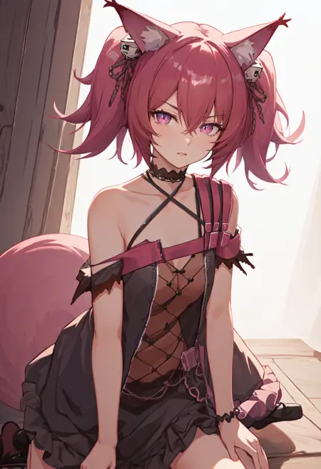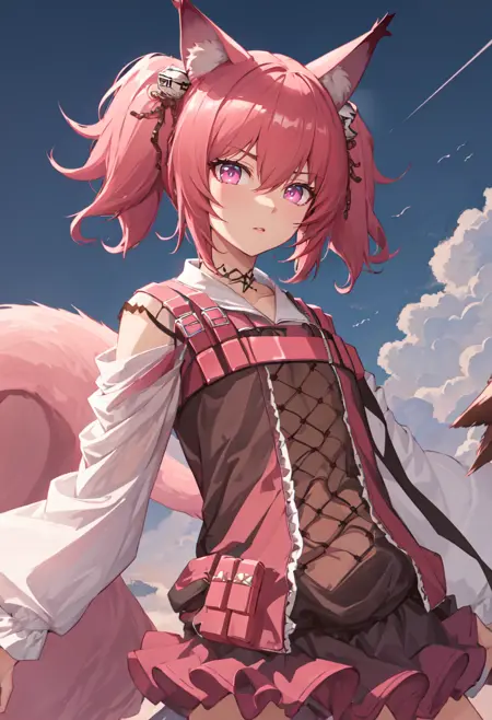 - The pruned character tags are animal ears, animal ear fluff, fox ears, twintails, pink hair, fox girl, tail, fox tail, hair between eyes, hair ornament, pink eyes, symbol-shaped pupils. You can add them into prompts when core features (e.g. hair color) of character is not so stable.