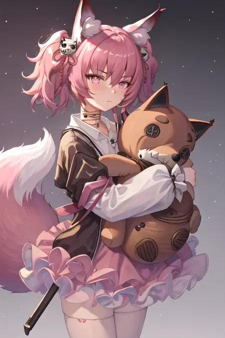 トリガーワードは shamare_arknights で、削除されたタグは animal_ears, animal_ear_fluff, fox_ears, twintails, pink_hair, fox_girl, tail, fox_tail, hair_between_eyes, hair_ornament, pink_eyes, symbol-shaped_pupils です。ある特徴(例:髪の色)が安定しない場合、これらのタグをプロンプトに追加できます。