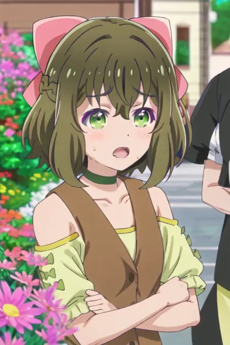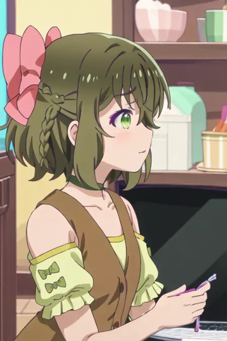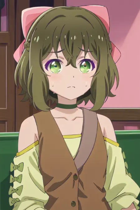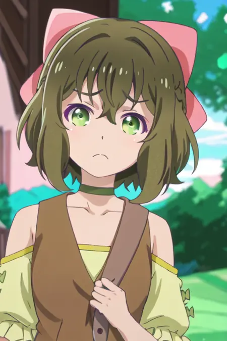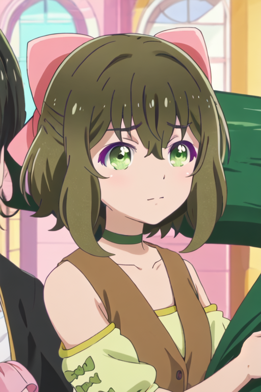触发词为 fina_kumakumakumabear,推荐标签为:best quality, masterpiece, highres, solo, {fina_kumakumakumabear:1.15}, bow, hair_bow, bangs, green_eyes, short_hair, brown_hair, hair_between_eyes, pink_bow, green_hair, collarbone。
