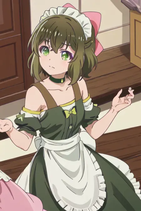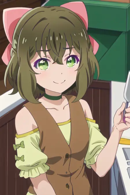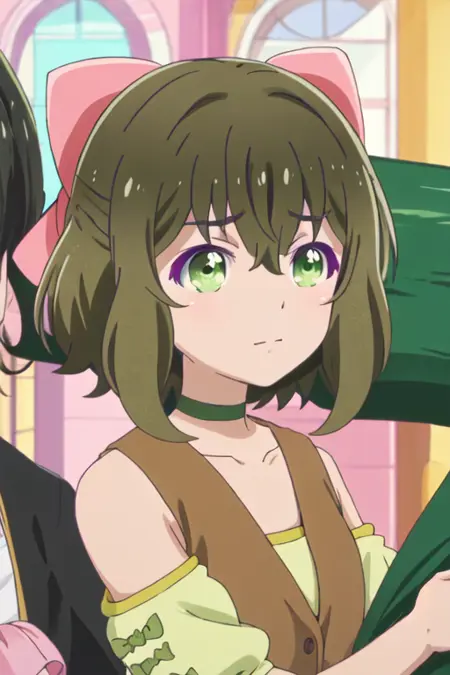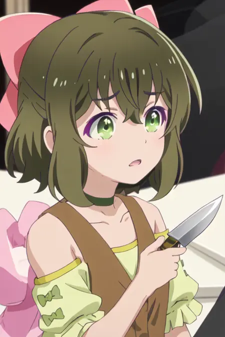 トリガー語はfina_kumakumakumabear、推奨タグはbest quality, masterpiece, highres, solo, {fina_kumakumakumabear:1.15}, bow, hair_bow, bangs, green_eyes, short_hair, brown_hair, hair_between_eyes, pink_bow, green_hair, collarboneです。