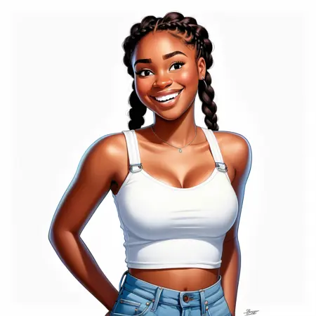 A pixar art style of a beautiful 22-year-old black woman with braces. She has a single braid.