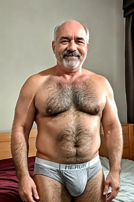 프롬프트: 중간 체형, 60세 평범한 남성의 초상화, 작은 속옷 차림, 상반신 노출, 침실에서 서 있는 자세, 모델 포즈, 미소, 고세부, HDR, 4K