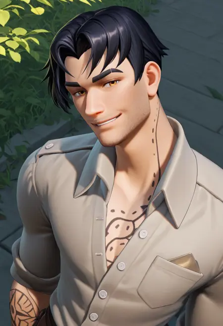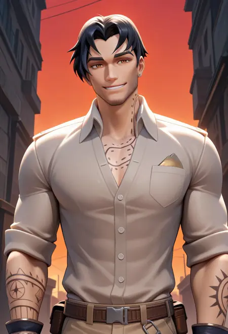 L0renzo, 1boy, broad shoulders, mature male, amber eyes, human, athletic build, black hair, tattoos