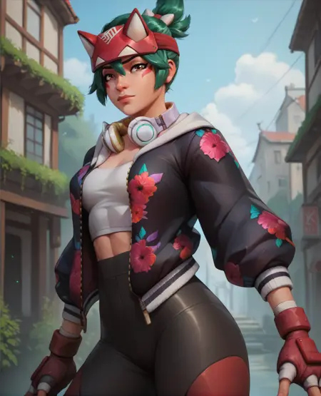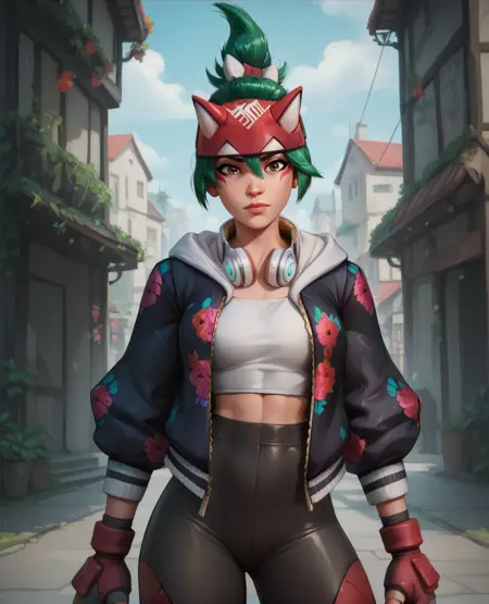 셔츠, 재킷, 검은 바지 또는 타이트한 바지, 여우 마스크, 복부 노출, 빨간 신발,