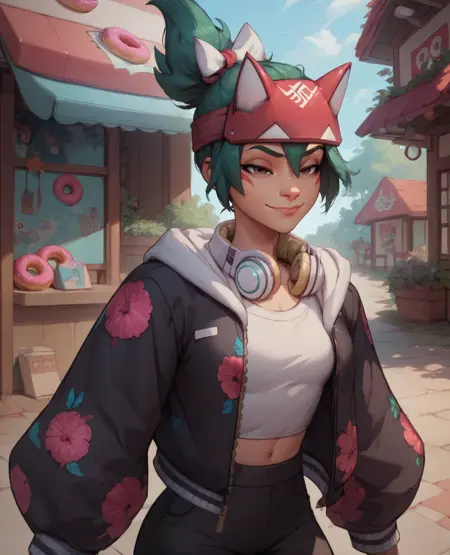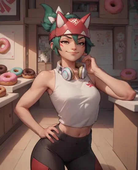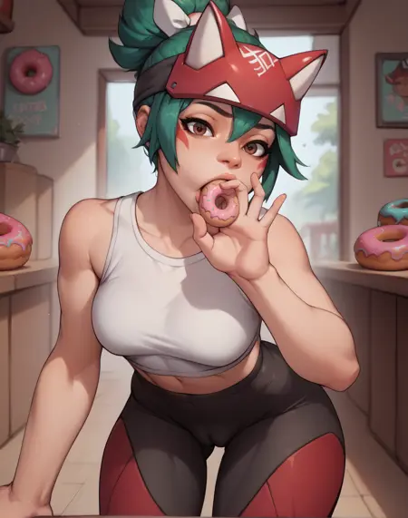 黑色长裤或黑色瑜伽裤——建议在负向提示中加入“牛仔裤、西裤、绿色裤子”
