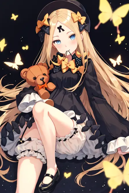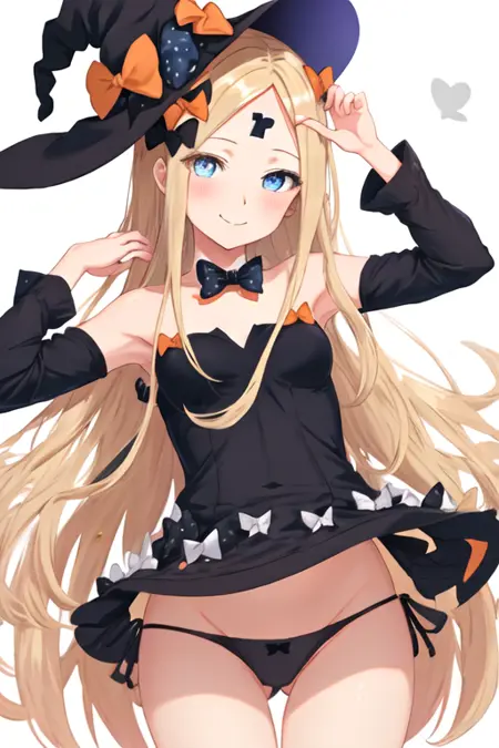 트리거 단어는 abigail_williams_fgo이며, 권장 태그는 best quality, masterpiece, highres, solo, {abigail_williams_fgo:1.15}, long_hair, bangs, parted_bangs, blonde_hair, bow, blue_eyes, orange_bow, black_bow, forehead, hair_bow, blush, polka_dot, polka_dot_bow, very_long_hair, breasts, small_breasts, multiple_hair_bows입니다.