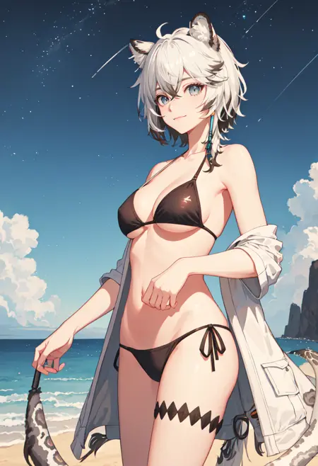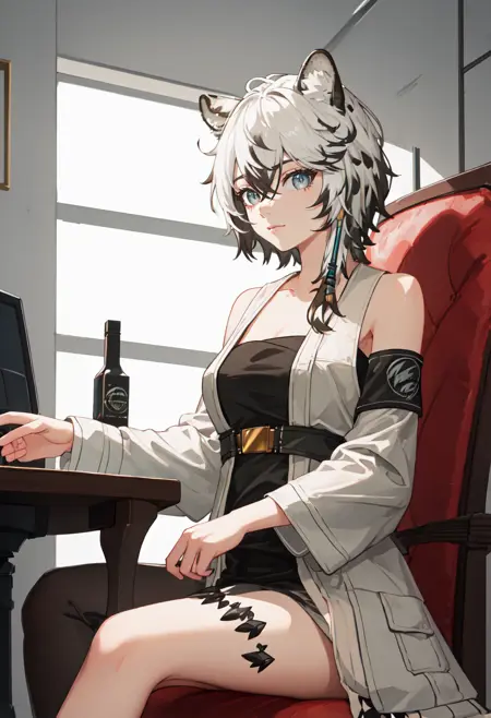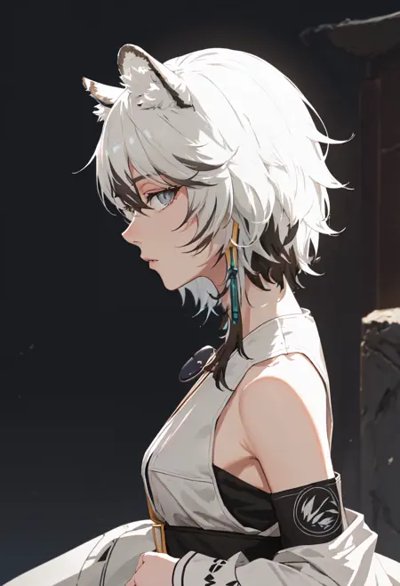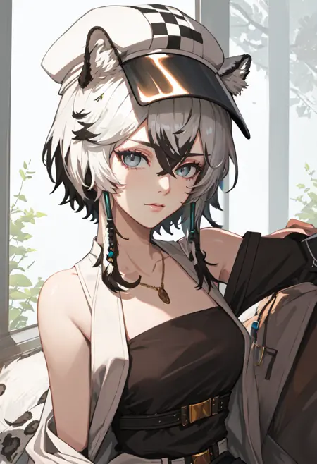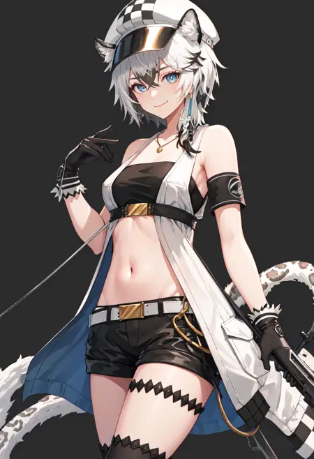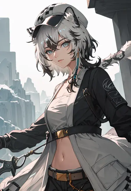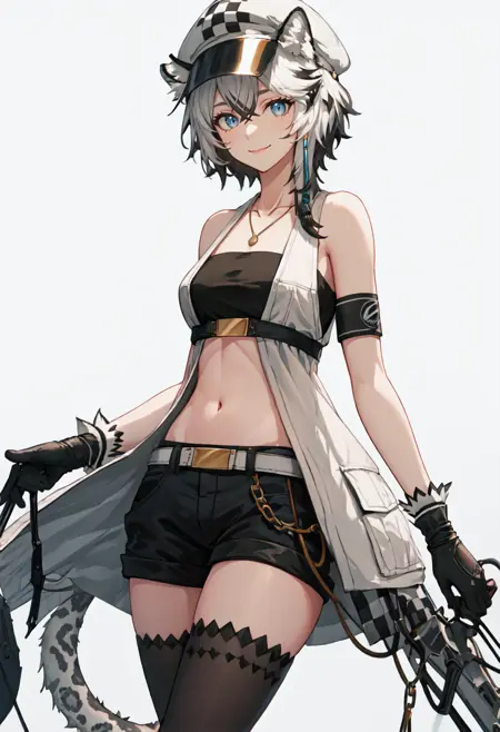 トリガーワードは cliffheart_arknights であり、削減されたタグは animal_ears, leopard_ears, grey_hair, short_hair, hair_between_eyes, animal_ear_fluff, tail, leopard_tail, breasts, hat, grey_eyes, cabbie_hat, white_headwear, multicolored_hair, medium_breasts, white_hair, black_hair, leopard_girl です。ある特徴(例:髪の色)が安定しない場合、これらをプロンプトに追加できます。