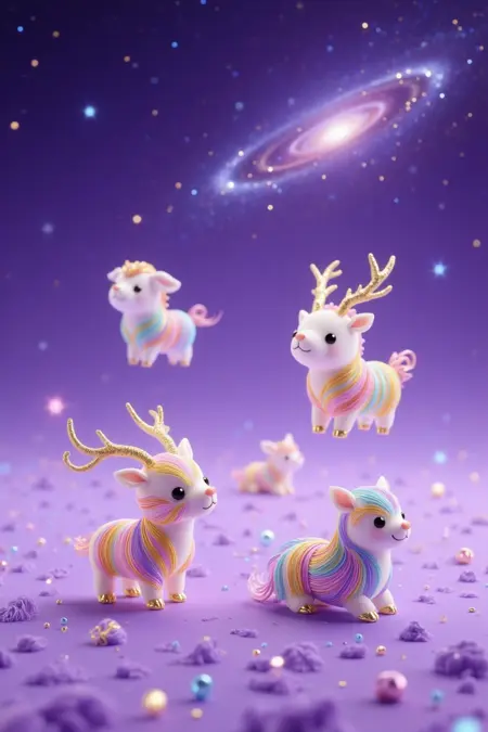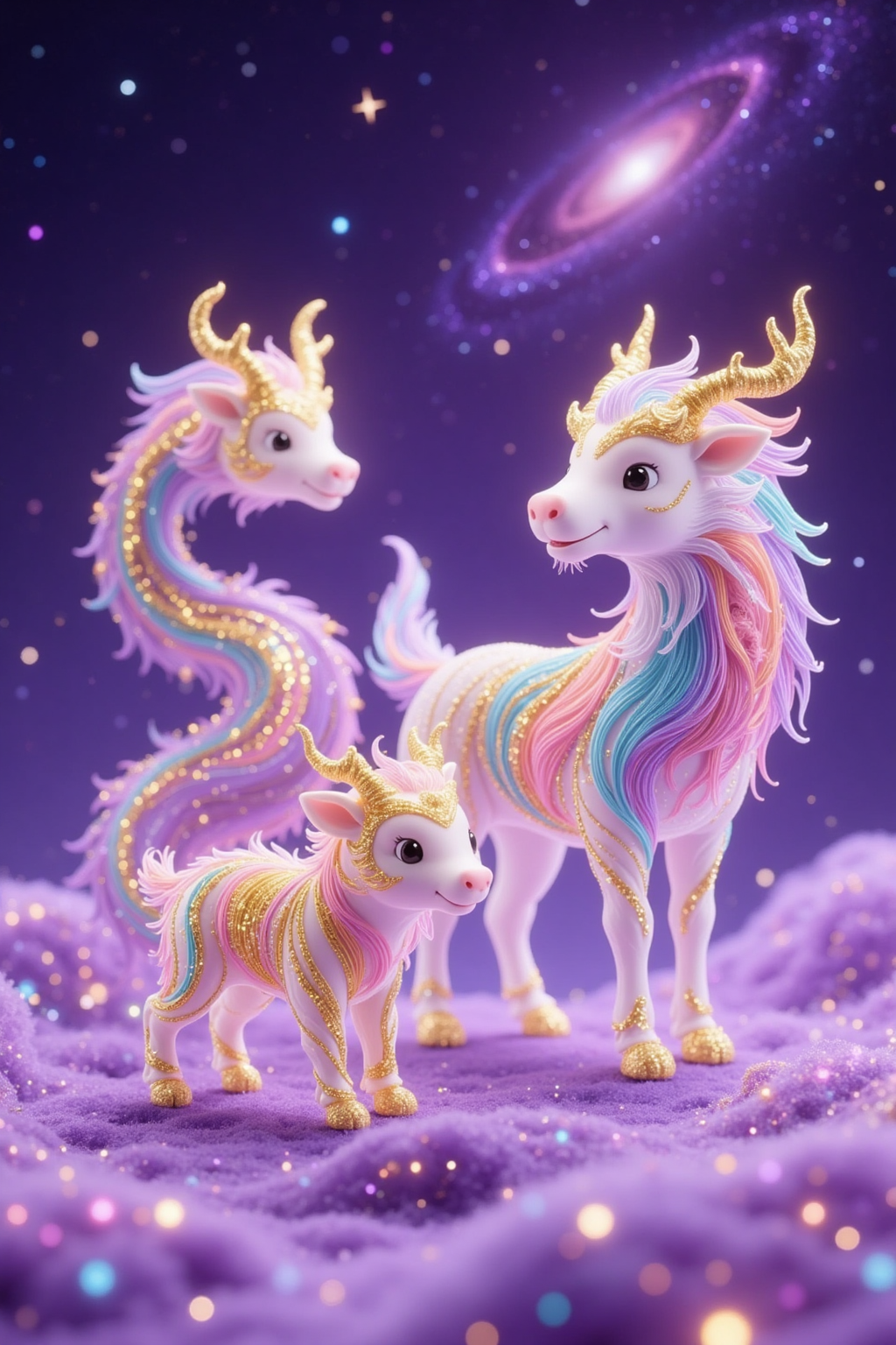 奇幻风格的中国生肖动物,覆盖着精致的彩色亮片,背景为紫色宇宙,点缀发光星辰与蜿蜒的星系臂。