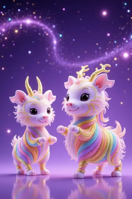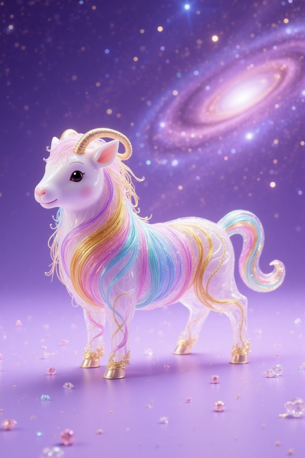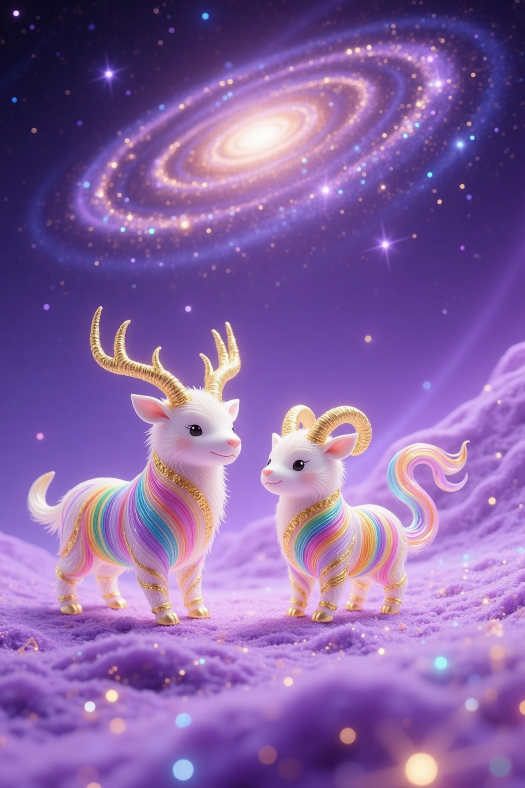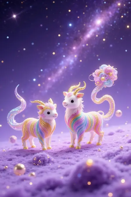 奇幻风格的中国生肖动物,呈现柔彩虹光质感,置于紫色天体领域,四周环绕着闪耀的星团与星系。