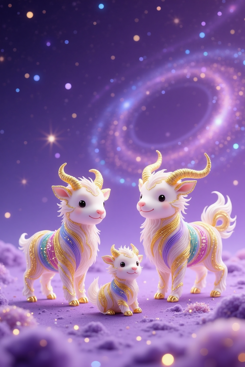 奇幻风格的中国生肖动物,装饰着金色闪亮细节,置身于梦幻紫色太空景观中,点缀着微小星辰与旋转星系。