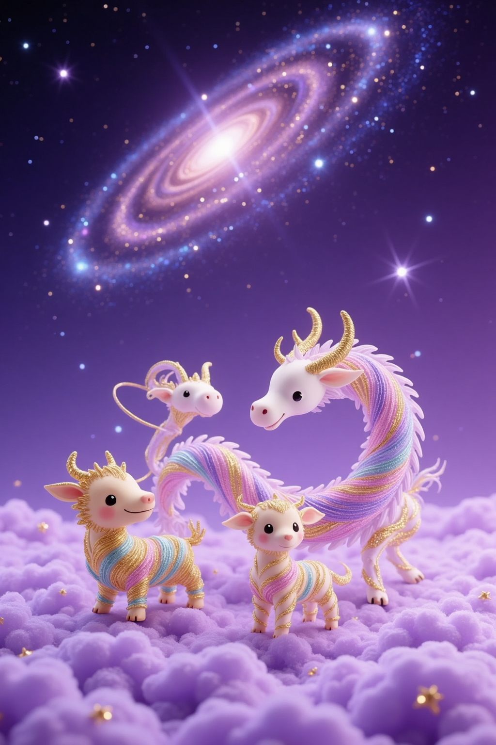奇幻风格的中国生肖动物,身形由柔软多彩的丝线构成,静卧于繁星点点的紫色天际,远处为发光的星系图案。