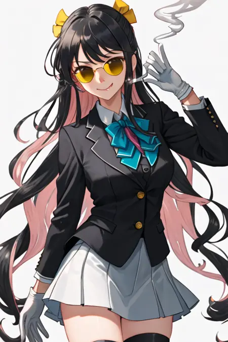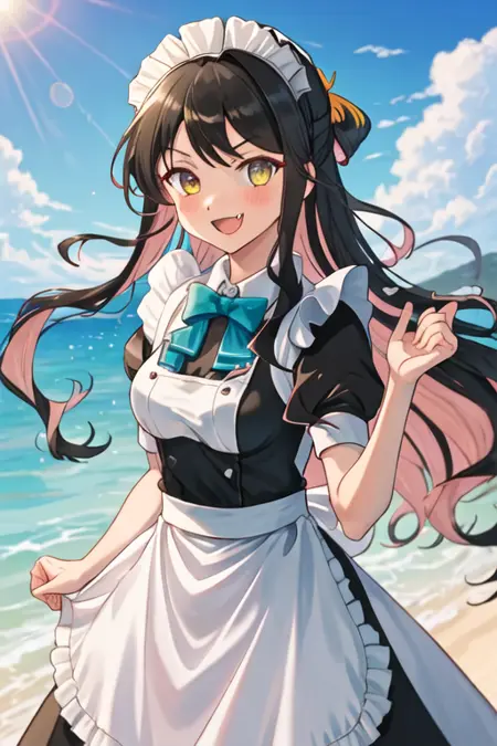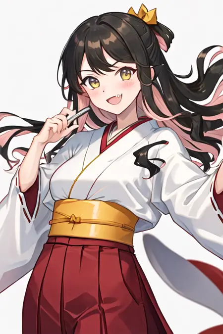 触发词为 naganami_kantaicollection,推荐标签为:best quality, masterpiece, highres, solo, {naganami_kantaicollection:1.15}, multicolored_hair, pink_hair, black_hair, long_hair, two-tone_hair, yellow_eyes, smile, fang, wavy_hair, ribbon, open_mouth, bow, blush, breasts, hair_ribbon。