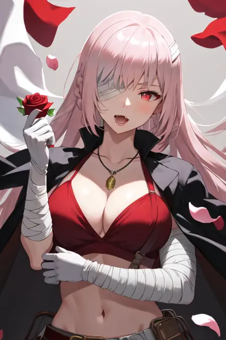 トリガー語はflorence_nightingale_fgo、推奨タグはbest quality, masterpiece, highres, solo, {florence_nightingale_fgo:1.15}, long_hair, pink_hair, red_eyes, breasts, military, large_breasts, bangs, braid, bandage_over_one_eyeです。