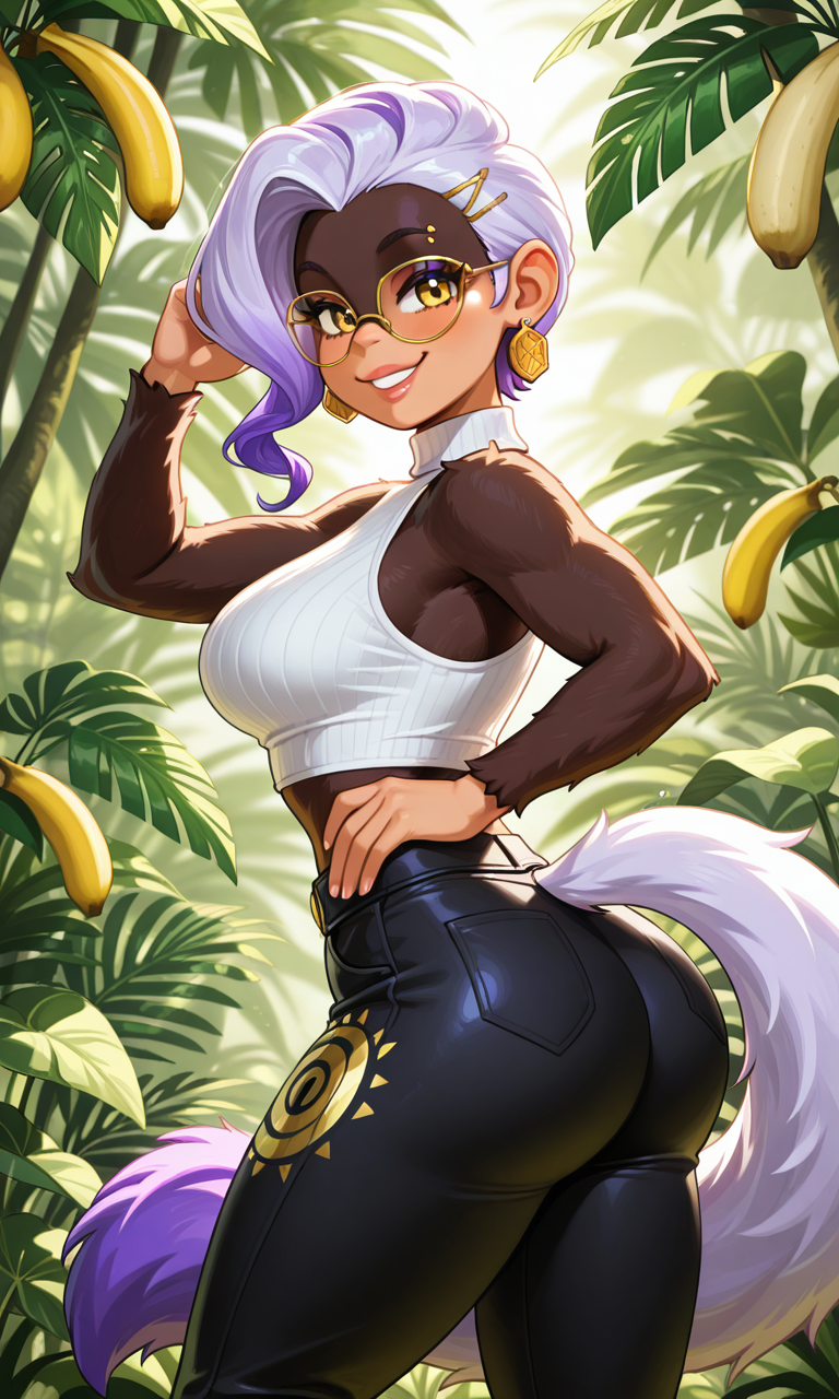 プロンプト: Poppy Kong_(DK Nintendo), 黒い毛並み, アンスロポモルフィックなコング, 紫のふわふわした尾, 黄色い目, 白い流れるような髪, 紫の髪の先端
