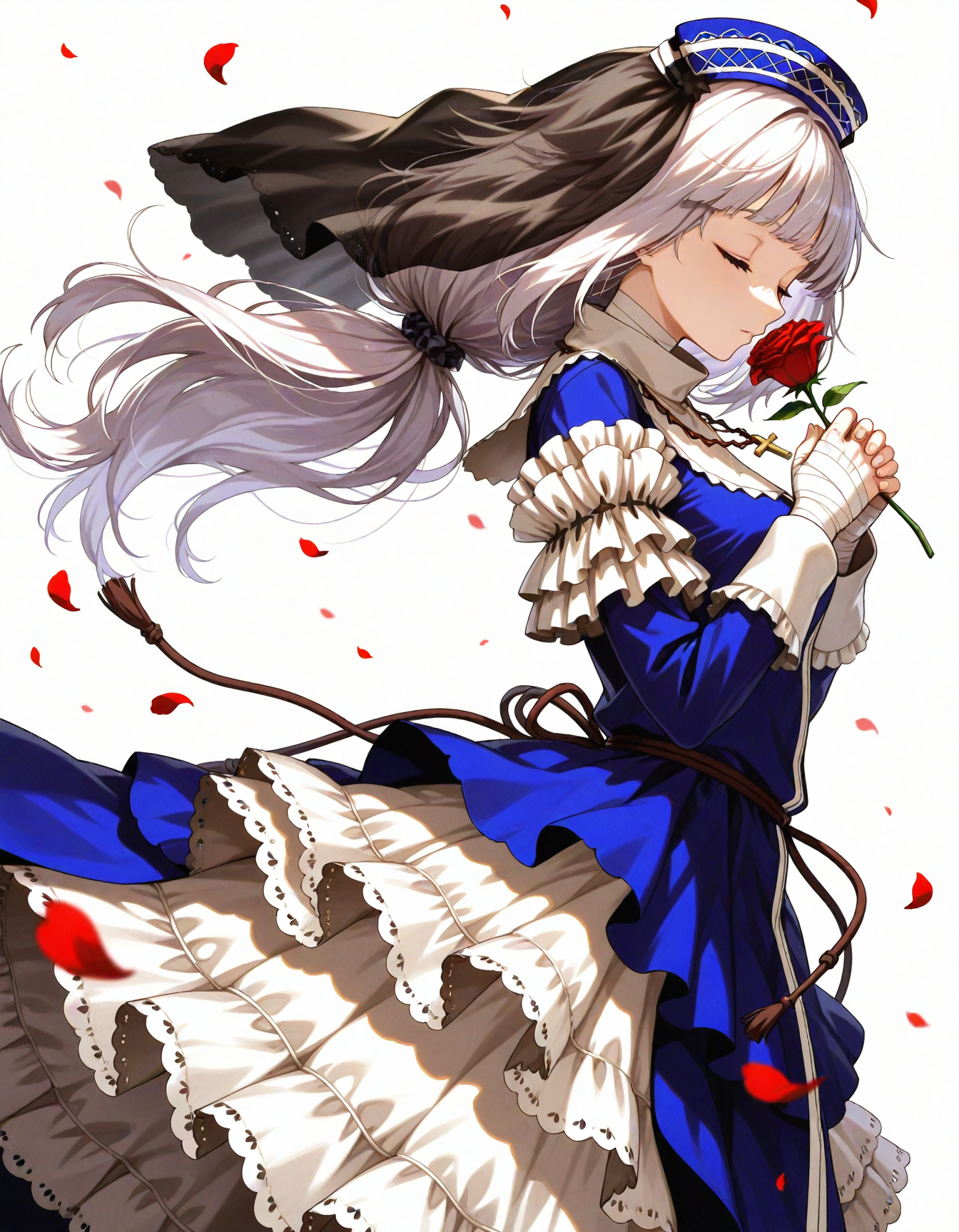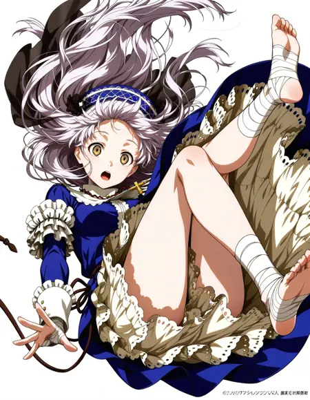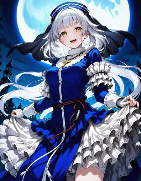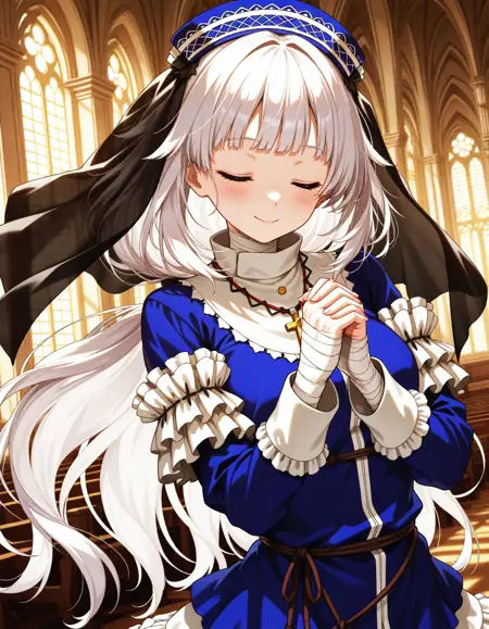 <lora:Claudia_Jerusalem_IXL10:1>claudia jerusalem, white hair, long hair, yellow eyes, bandages, bandaged hand, bandaged neck, blue headwear, veil, frills, cross necklace, blue dress, long sleeves, white skirt, layered skirt,