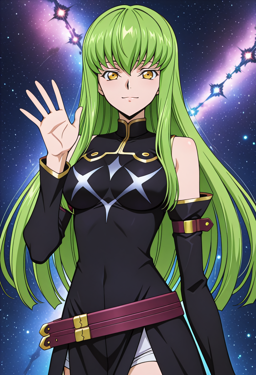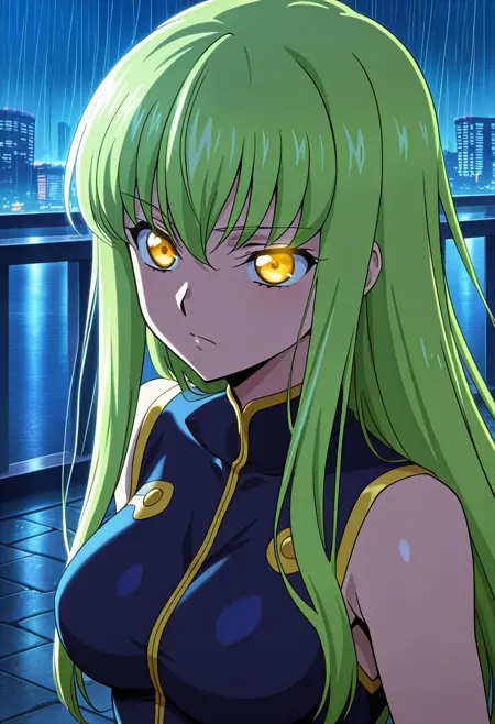 1girl, solo, green hair, long hair, yellow eyes, medium breasts