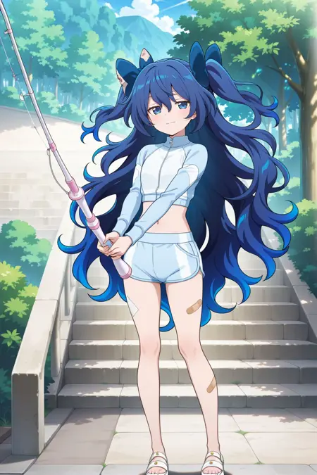 yorigami shion, 1girl, solo, blue eyes, blue hair, long hair, wavy hair, two side up, yorigami shion \(somewhat successful big sister\), alternate costume, alternate hairstyle, hair bow, blue bow, cropped jacket, two-tone jacket, blue jacket, white jacket, zipper, navel, two-tone shorts, blue shorts, white shorts, short shorts, striped shorts, bandaid on leg, white sandals, holding fishing rod,