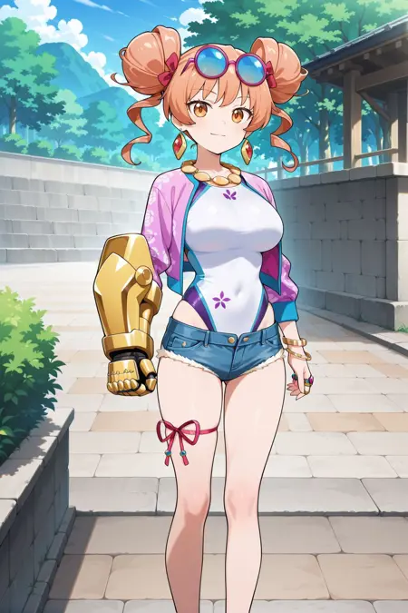 yorigami jo'on, 1girl, solo, orange eyes, orange hair, double bun, drill hair,, yorigami jo'on \(somewhat successful litte sister\), alternate costume, alternate hairstyle, eyewear on head, round eyewear, pink-framed eyewear, blue-tinted eyewear , pink earrings, coin necklace, pink jacket, open jacket, print jacket, long sleeves, highleg one-piece swimsuit, white swimsuit, bracelet, denim shorts, short shorts, pink leg ribbon, thigh ribbon, white sandals, simple gauntlet, gold power fist,
