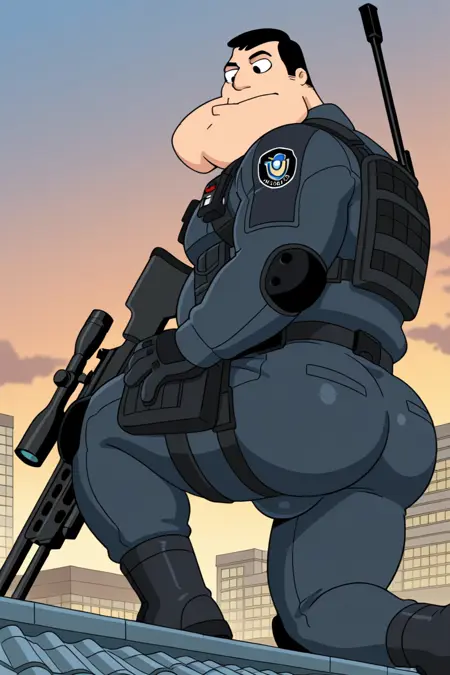 斯坦,一名男性,成熟男性,体型健壮,有肚子,老爸身材, bara风格,黑发,黑眼睛,圆耳朵,大下巴,蓝色西装,美国国旗胸针,白色领衬衫,黑色领带,蓝色长裤,黑色皮鞋,